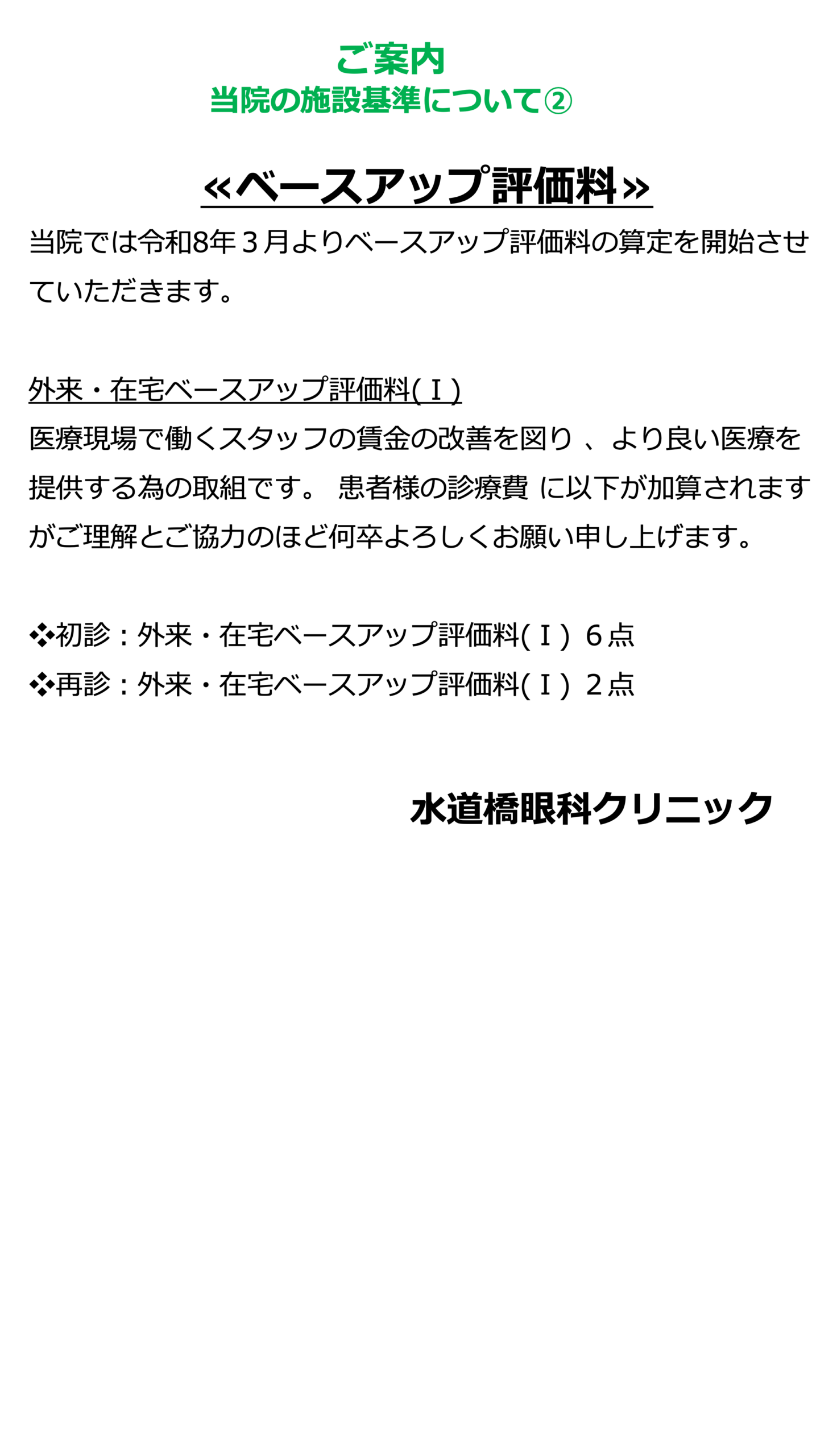 当院の施設基準について ● 投稿日:2026年3月25日 ● カテゴリー:お知らせ 診療内容 コンタクトレンズ・眼鏡処方 花粉症・アレルギー ドライアイ 白内障 緑内障 網膜疾患 眼精疲労 新着のお知らせ 当院の支払い方法について マイナンバーカードについ… 当院の施設基準について ホームページを開設しまし…