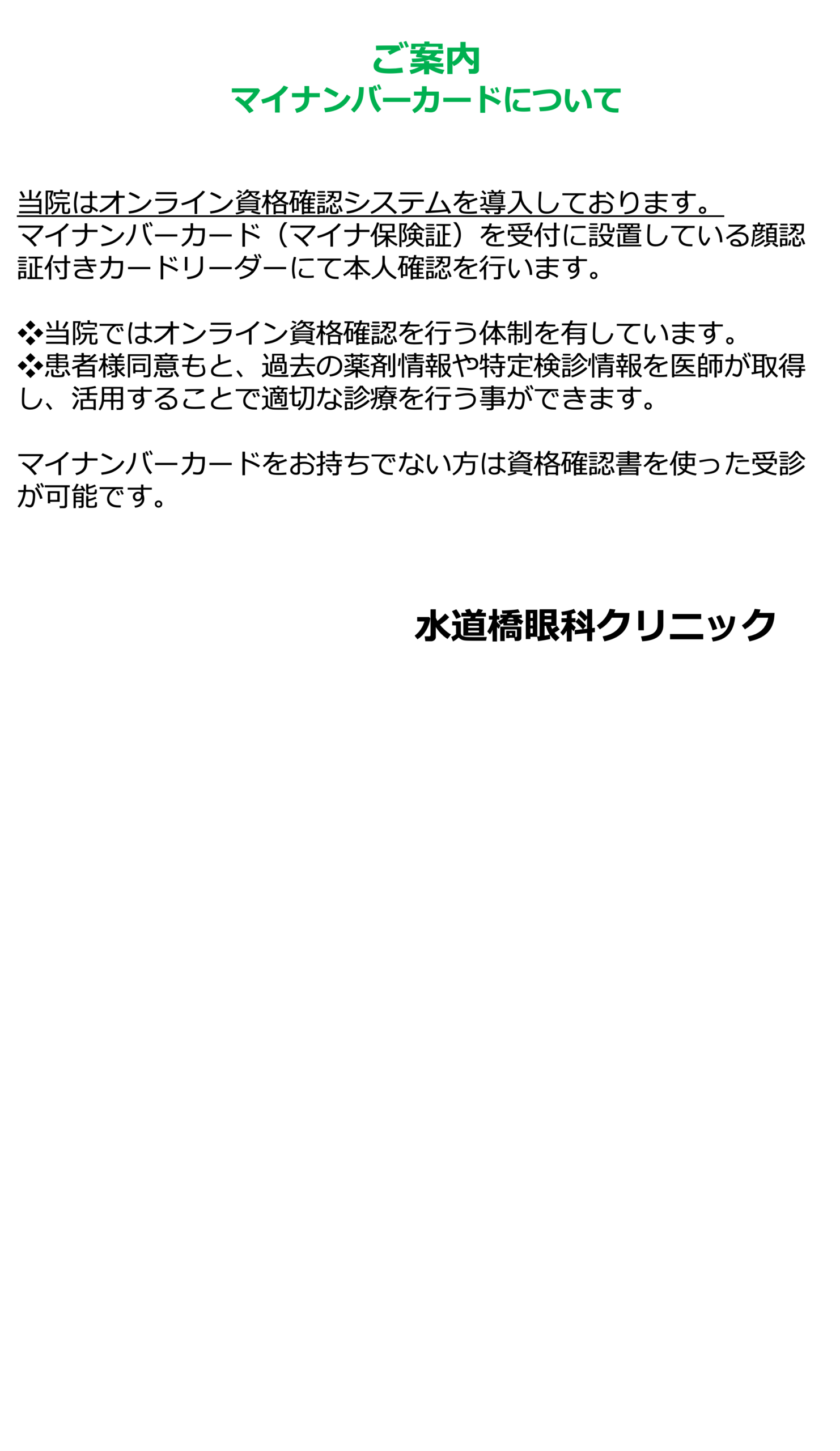 マイナンバーカードについて ● 投稿日:2026年3月25日 ● カテゴリー:お知らせ 診療内容 コンタクトレンズ・眼鏡処方 花粉症・アレルギー ドライアイ 白内障 緑内障 網膜疾患 眼精疲労 新着のお知らせ 当院の支払い方法について マイナンバーカードについ… 当院の施設基準について ホームページを開設しまし…